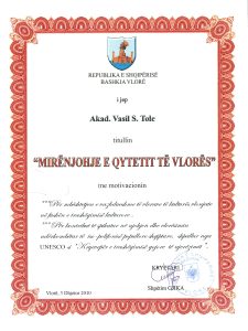 | 2010 | “Mirënjohje e qytetit të Vlorës”, dhënënga Bashkia Vlorë |