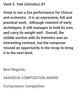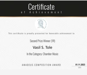 | 2023 | Fitues i çmimit të dytë (1R) në kategorinë «Chamber music» në konkursin ndërkombëtar «Amadeus Composition Award», Vjenë, Austri me veprën «Introitus» për kor dhe orkestër harqesh. |