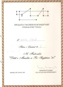 | 1997 | Çmimin e G.M.E.M (Grupi i Muzikës Eksperimentale Marsejë) përveprën “Shatra-patra” të interpretuar në konkursin ndërkombëtar “Ton de Leeuw”, në “Ditët e Muzikës së Re 1997”. |