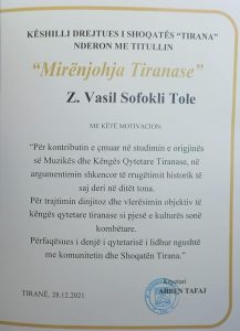 | 2021 | «Mirënjohja Tiranase», dhënë nga shoqata «TIRANA» për kontributin në studimin e trashëgimisë muzikore popullore të Tiranës. |