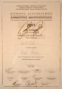 | 2001 | Fitues i çmimit të parë në konkursin ndërkombëtar të kompozimit “Dimitri Mitropoulos”, Athinë Nëndor 2001 me veprën “EUMENIDES” |